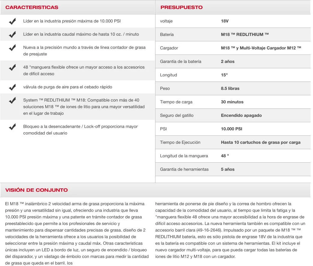herramienta de ponerse de pie diseño y la correa de hombro ofrecen la capacidad de la comodidad del usuario, al tiempo que limita la fatiga y la "manguera flexible 48 ofrece una mayor accesibilidad a la hora de engrase de difícil acceso accesorios. La nueva herramienta también es compatible con un accesorio barril clara (49-16-2646). Impulsado por un paquete de M18 ™ ™ REDLITHIUM batería, esto es sólo pistola de engrase 18V de la industria que es la batería es compatible con un sistema de herramientas. El kit incluye el nuevo cargador multi-voltaje, para que pueda cargar todas las baterías de iones de litio M12 y M18 con un cargador.