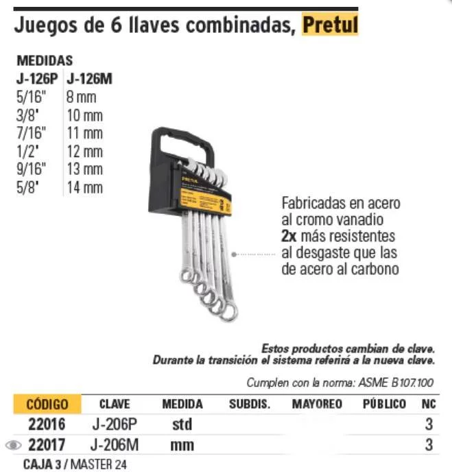 JUEGO 6 LLAVES COMBINADAS MM PRETUL J-126M PRETUL