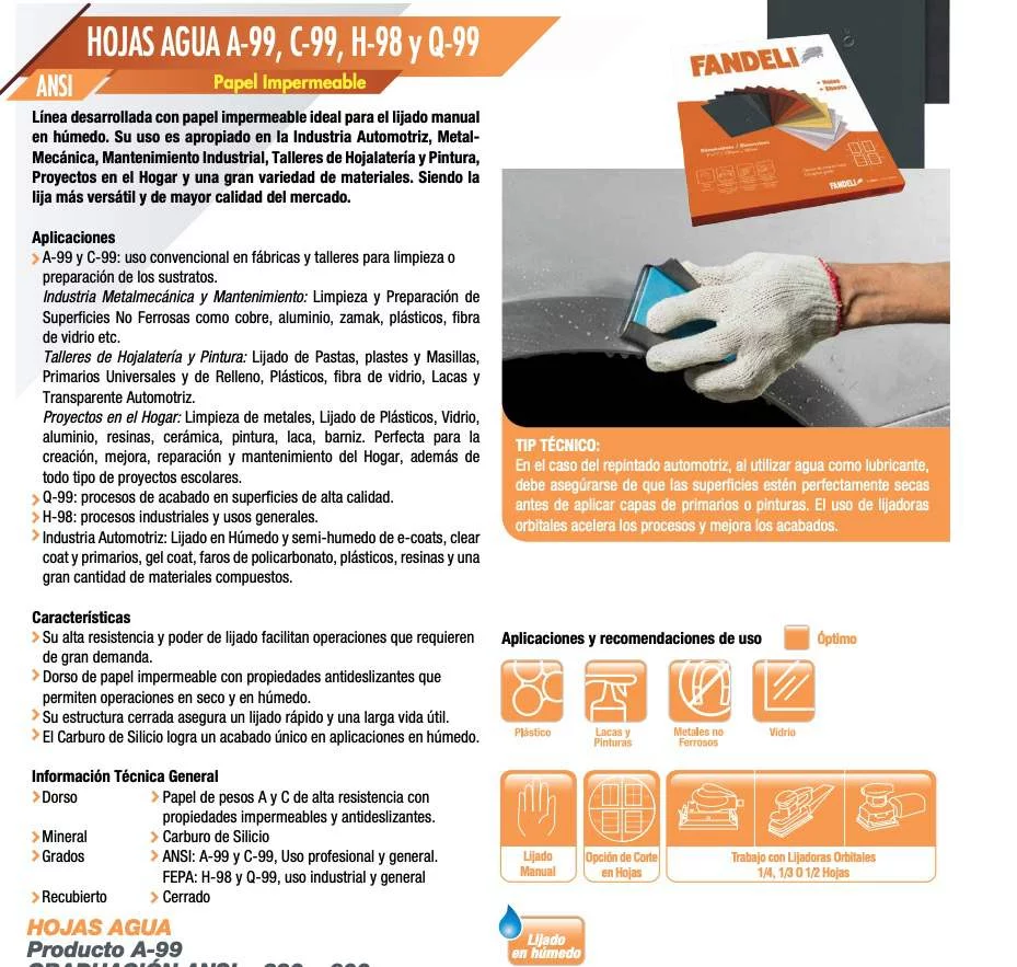 Línea desarrollada con papel impermeable ideal para el lijado manual en húmedo. Su uso es apropiado en la Industria Automotriz, Metal-Mecánica, Mantenimiento Industrial, Talleres de Hojalatería y Pintura, Proyectos en el Hogar y una gran variedad de materiales. Siendo la lija más versátil y de mayor calidad del mercado.