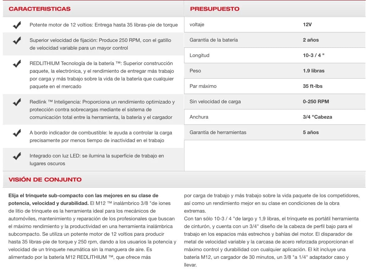 Elija el trinquete sub-compacto con las mejores en su clase de potencia, velocidad y durabilidad. El M12 ™ inalámbrico 3/8 "de iones de litio de trinquete es la herramienta ideal para los mecánicos de automóviles, mantenimiento y reparación de los profesionales que buscan el máximo rendimiento y la productividad en una herramienta inalámbrica subcompacto. Se utiliza un potente motor de 12 voltios para producir hasta 35 libras-pie de torque y 250 rpm, dando a los usuarios la potencia y velocidad de un trinquete neumática sin la manguera de aire. Es alimentado por la batería M12 REDLITHIUM ™, que ofrece más