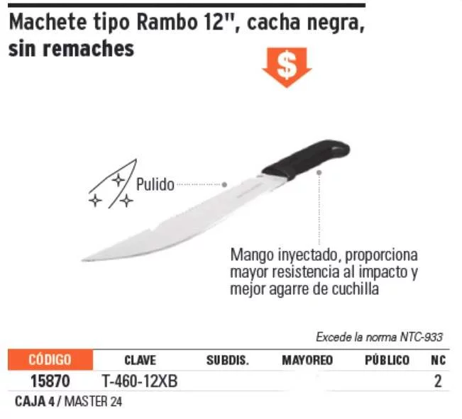 MACHETE TIPO RAMBO 12 CACHA NEGRA CON FUNDA