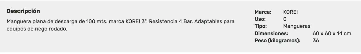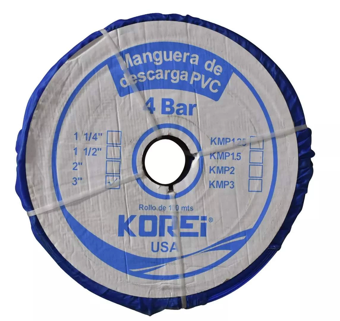 Manguera plana de descarga de 100 mts. marca KOREI 3". Resistencia 4 Bar. Adaptables para equipos de riego rodado.