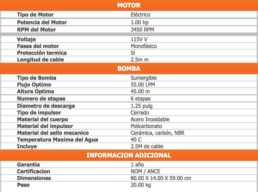 BOMBA SUMERGIBLE MULTIETAPAS 1.0HP TIPO BALA 115V