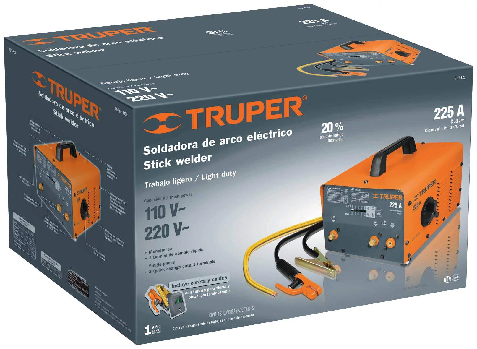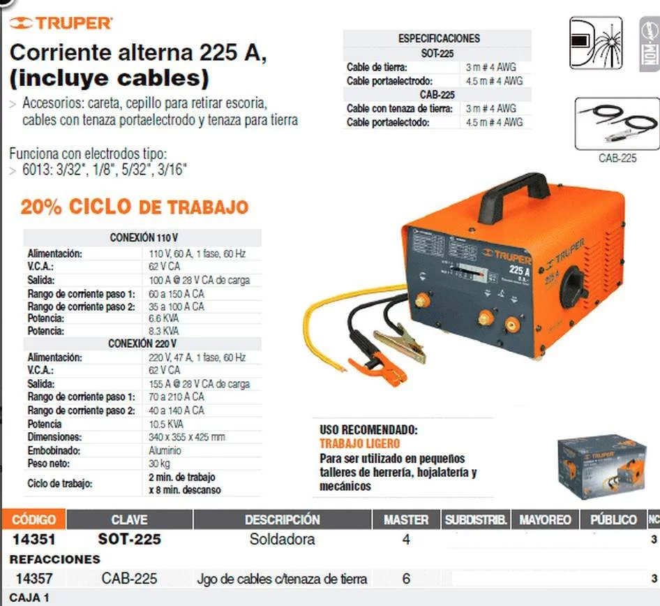 > Accesorios: careta, cepillo para retirar escoria, cables con tenaza portaelectrodo y tenaza para tierra