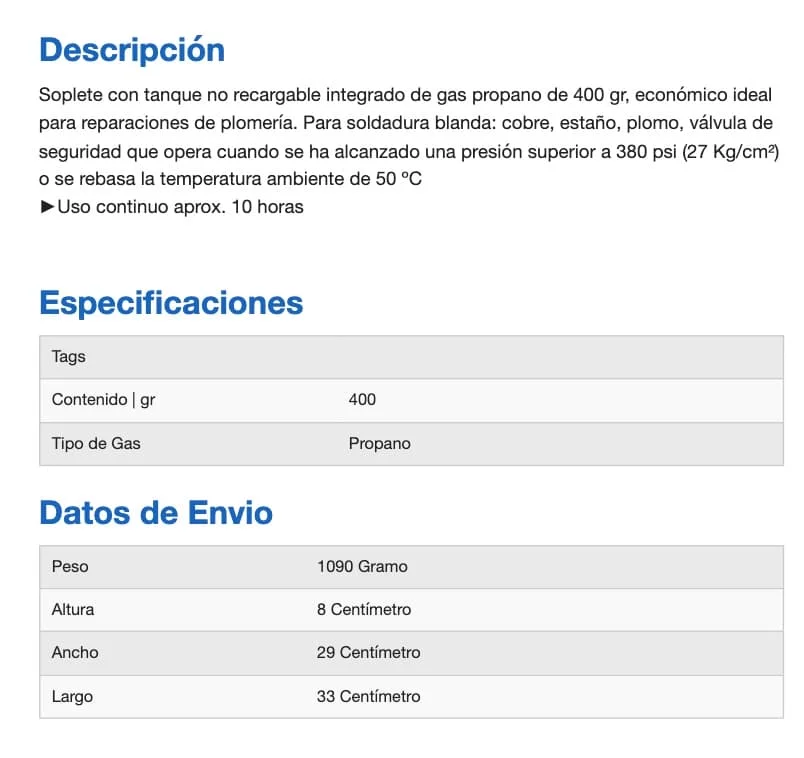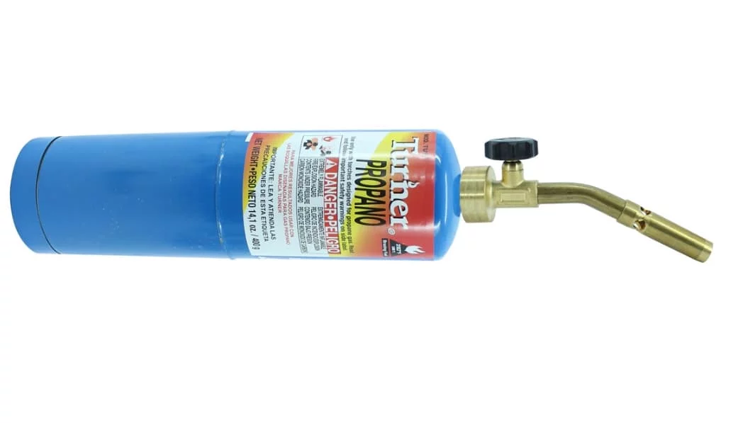 Soplete con tanque no recargable integrado de gas propano de 400 gr, económico ideal para reparaciones de plomería. Para soldadura blanda: cobre, estaño, plomo, válvula de seguridad que opera cuando se ha alcanzado una presión superior a 380 psi (27 Kg/cm2) o se rebasa la temperatura ambiente de 50 °C