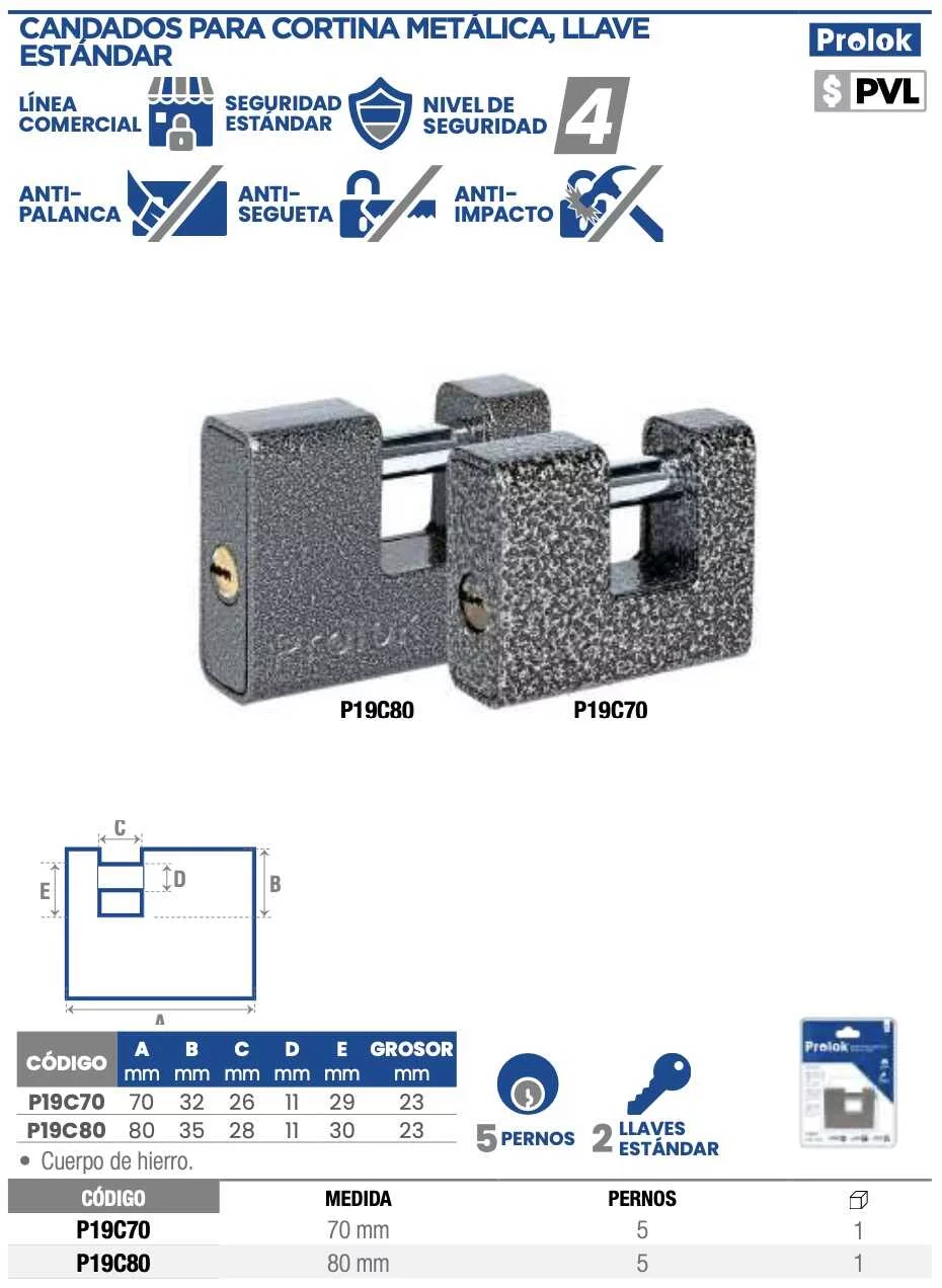 Candado p/cortina metalica 70mm negro llave std Prolok