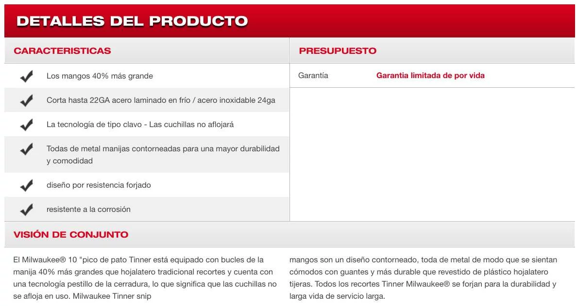 El Milwaukee® 10 "pico de pato Tinner está equipado con bucles de la manija 40% más grandes que hojalatero tradicional recortes y cuenta con una tecnología pestillo de la cerradura, lo que significa que las cuchillas no se afloja en uso. Milwaukee Tinner snip