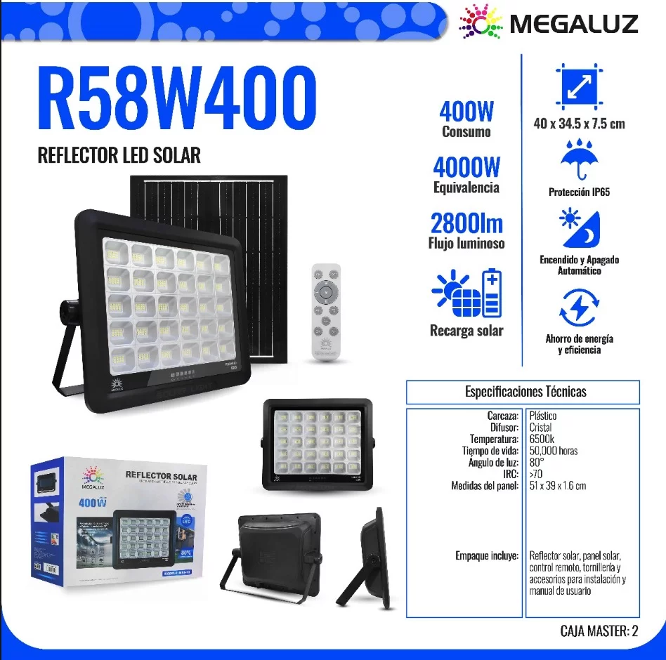 REFLECTOR LED SOLAR 400W 28000LM CON PANEL Y CABLE
