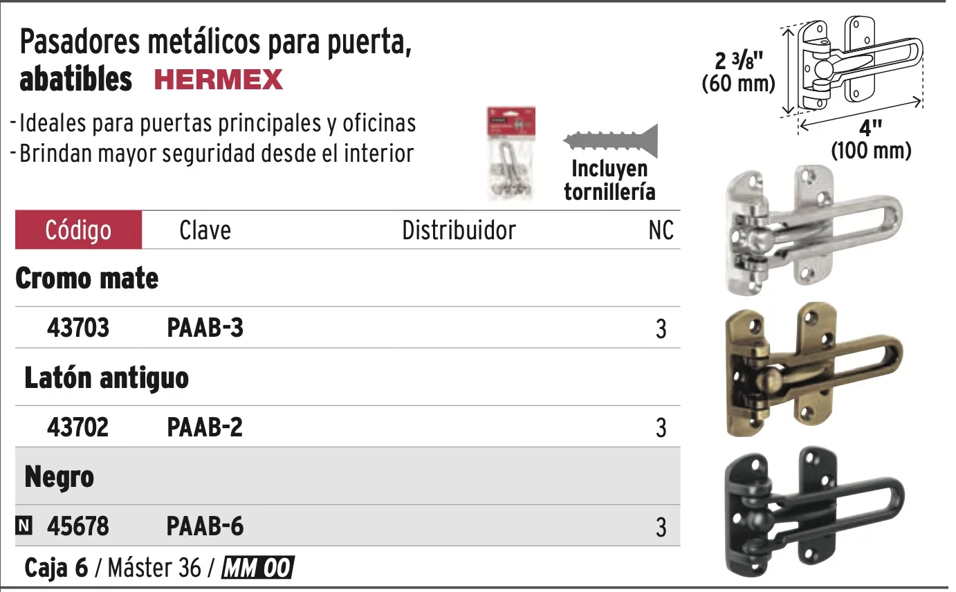 PASADOR ABATIBLE PARA PUERTA, ACABADO NEGRO, HERMEX,PASADORES PARA PUERTA