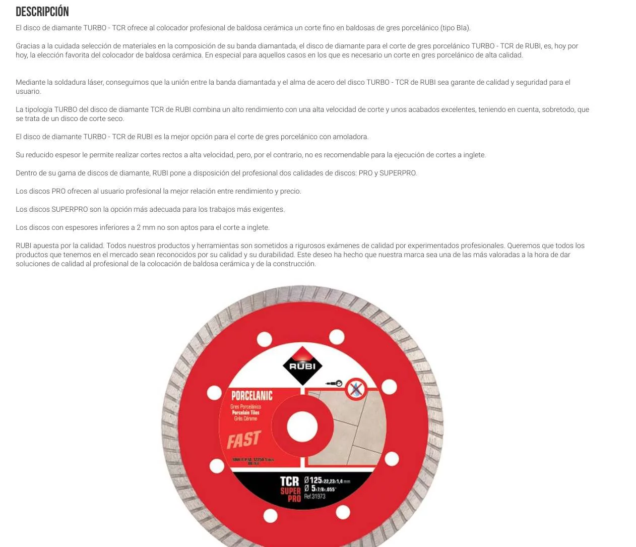 Gracias a la cuidada selección de materiales en la composición de su banda diamantada, el disco de diamante para el corte de gres porcelánico TURBO - TCR de RUBI, es, hoy por hoy, la elección favorita del colocador de baldosa cerámica. En especial para aquellos casos en los que es necesario un corte en gres porcelánico de alta calidad.