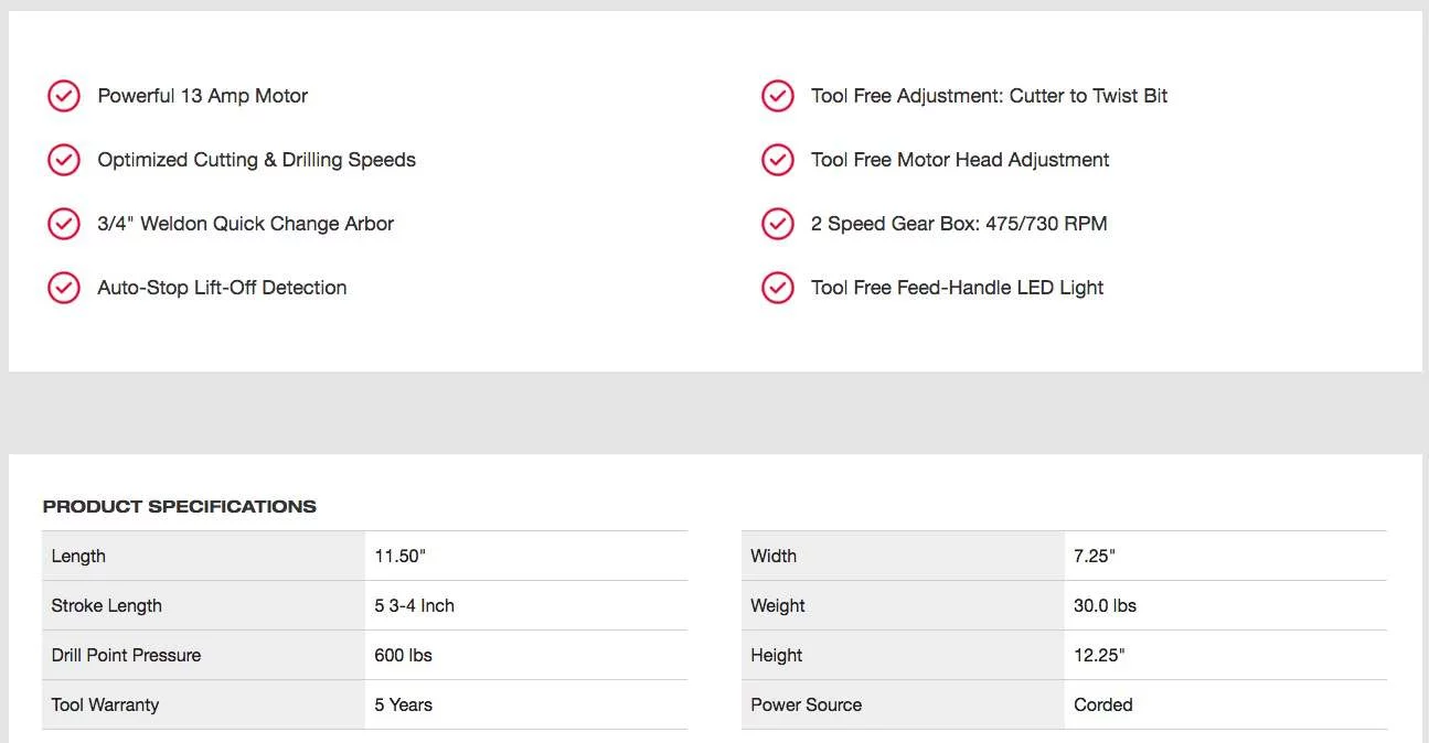 (2) Tool Free Motor Head Adjustment 0 2 Speed Gear Box: 475/730 RPM (2) Tool Free Feed-Handle LED Light