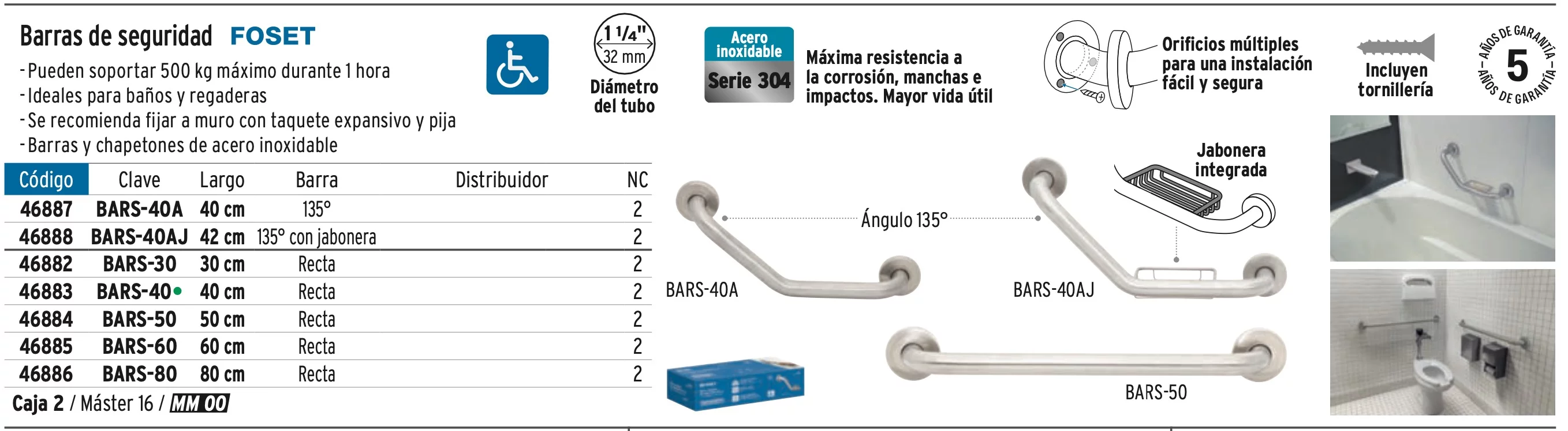 BARRA RECTA DE SEGURIDAD, ACERO INOX, 1-1/4' X 50CM, FOSET,ACCESORIOS PARA BAÒOS P˙BLICOS