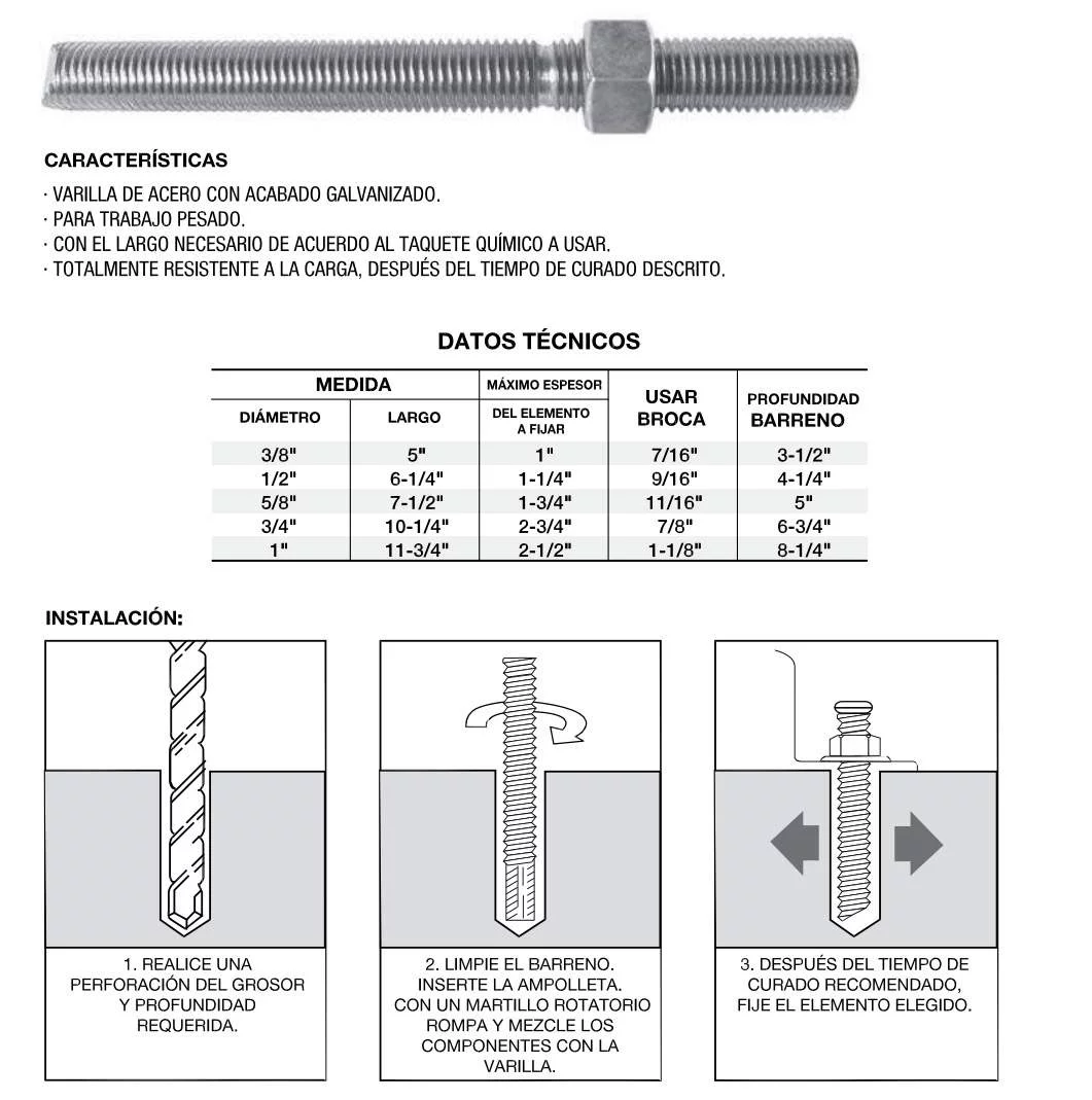 VARILLA PARA TAQUETE QUIMICO ANCLAJE 3/8X5