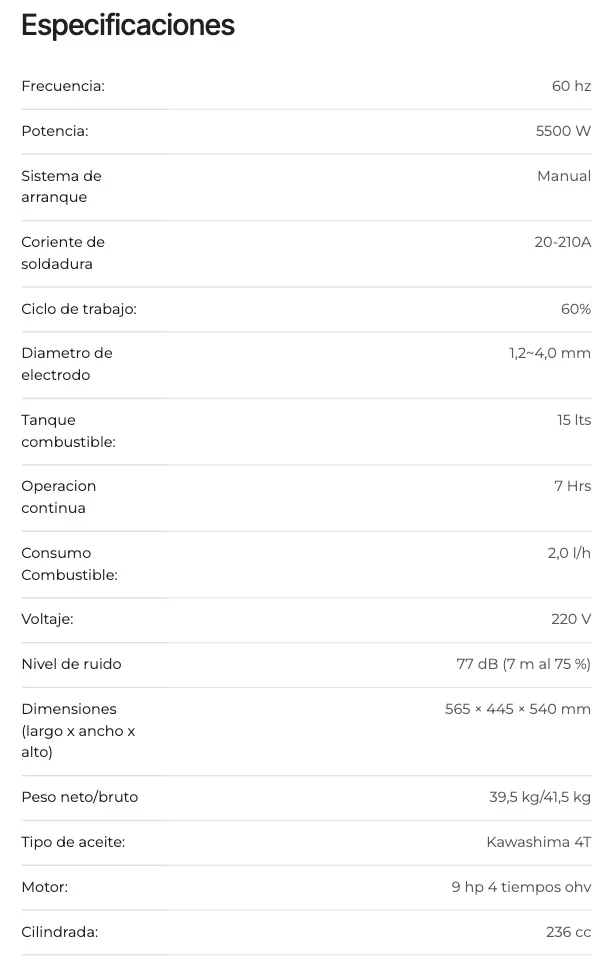 GENERADOR SOLDADOR 210A 5500W 220V 9HP INVERTER PARAZZINI