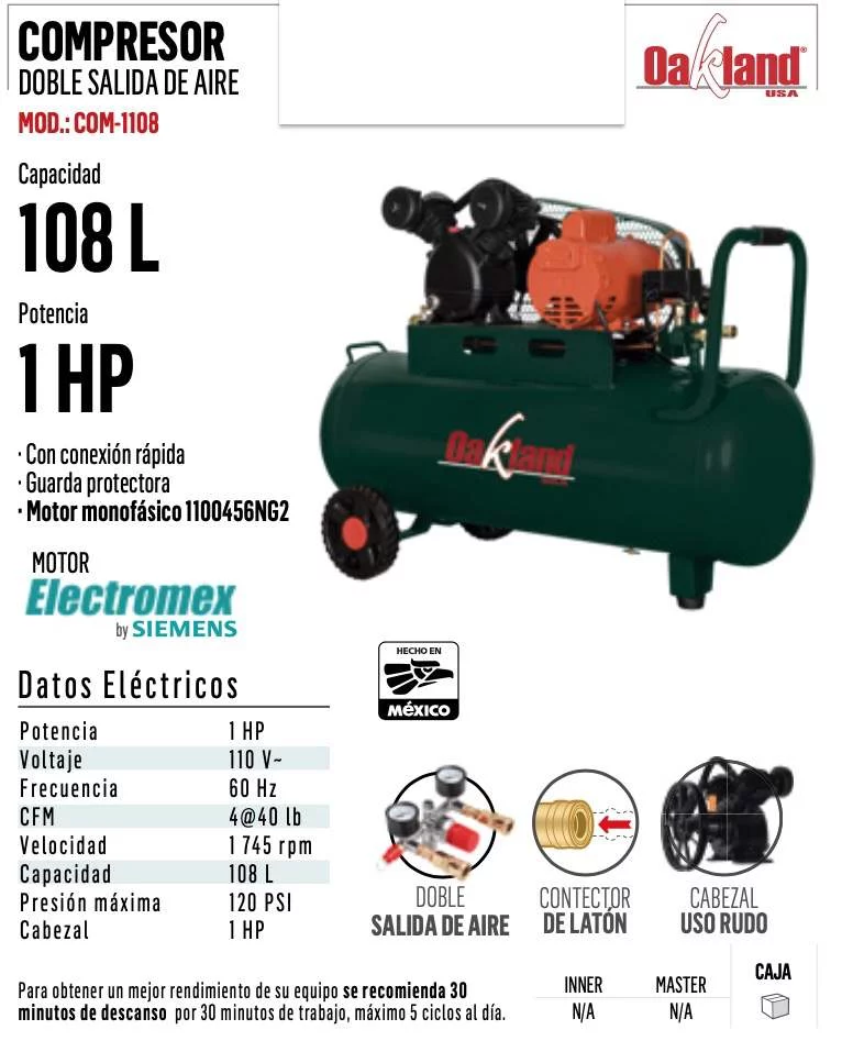 COMPRESOR 1 ETAPA MONOFASICO 1HP 108L 120PSI OAKLA