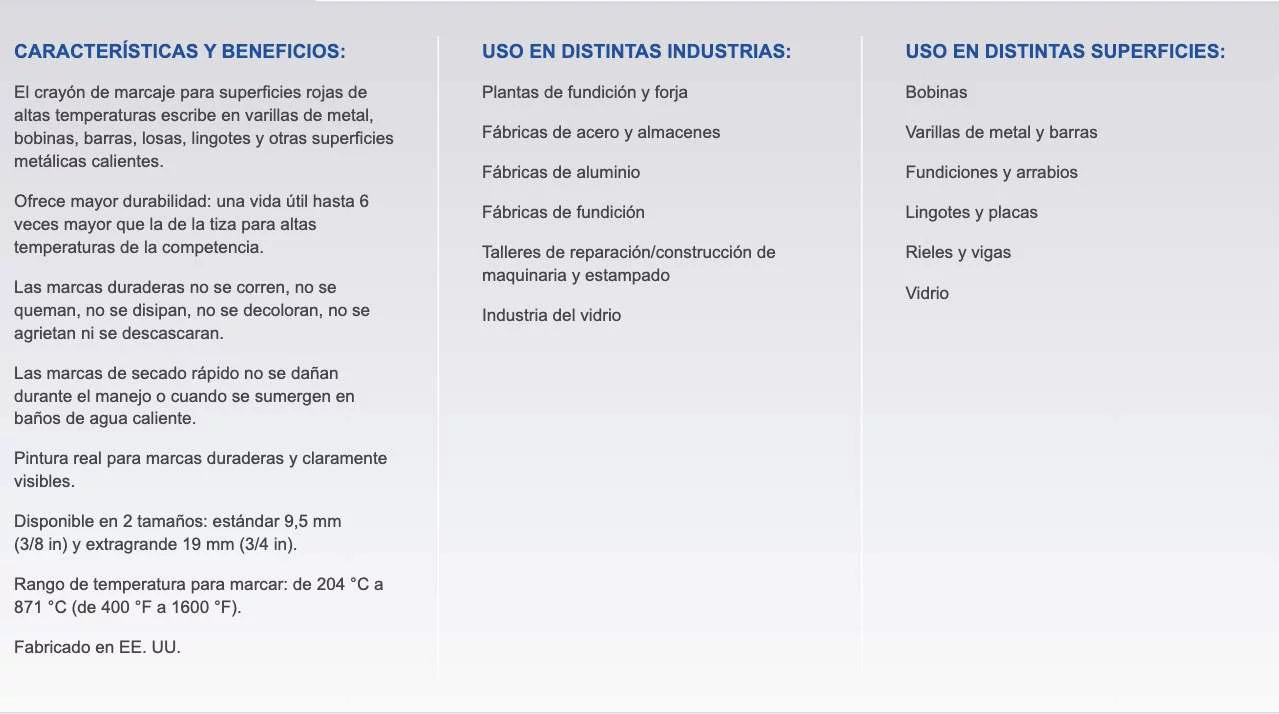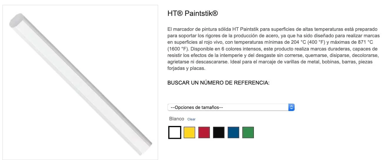 El marcador de pintura sólida HT Paintstik para superficies de altas temperaturas está preparado para soportar los rigores de la producción de acero, ya que ha sido diseñado para realizar marcas en superficies al rojo vivo, con temperaturas mínimas de 204 °C (400 °F) y máximas de 871 °C (1600 °F). Disponible en 6 colores intensos, este producto realiza marcas duraderas, capaces de resistir los efectos de la intemperie y del desgaste sin correrse, quemarse, disiparse, decolorarse, agrietarse ni descascararse. Ideal para el mareaje de varillas de metal, bobinas, barras, piezas forjadas y placas.