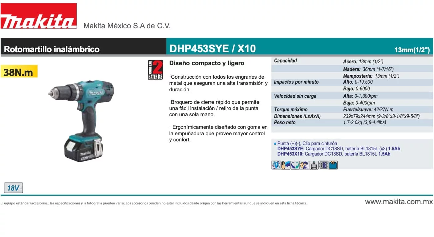 DHP453X10: Cargador DC18SD, batería BL1815L 1.5Ah