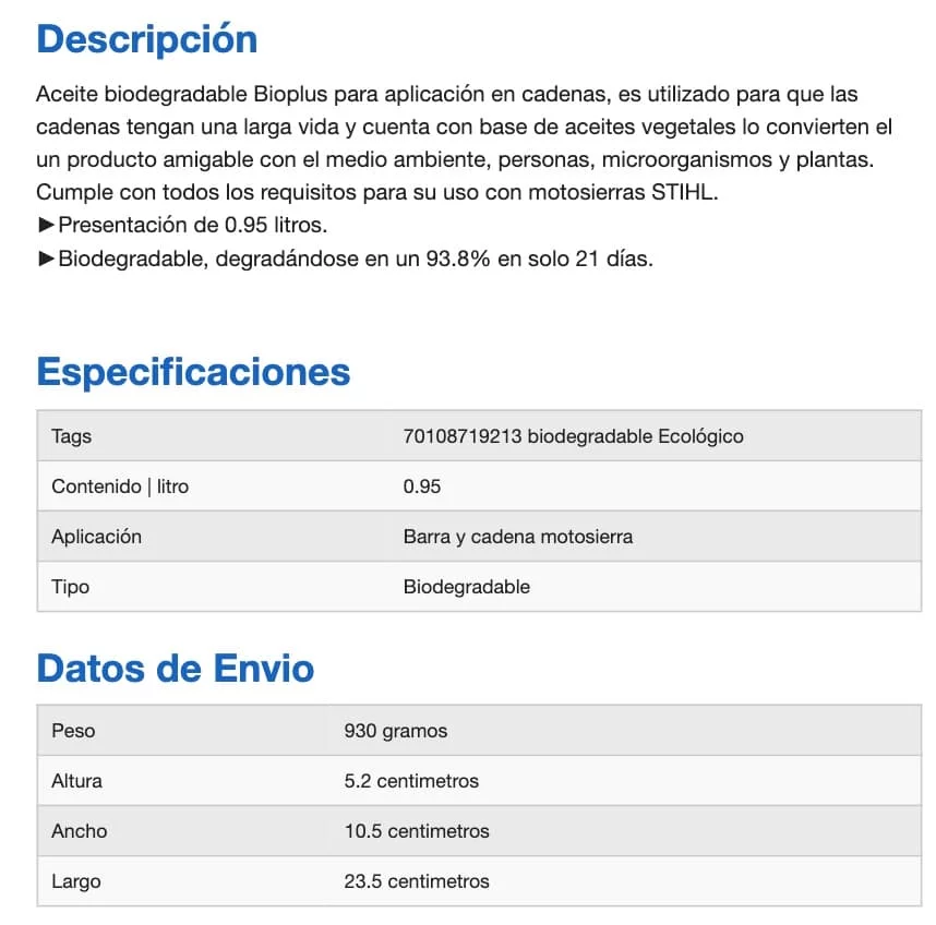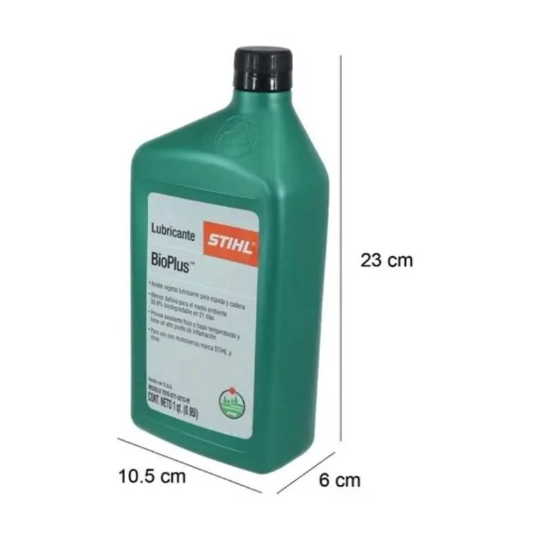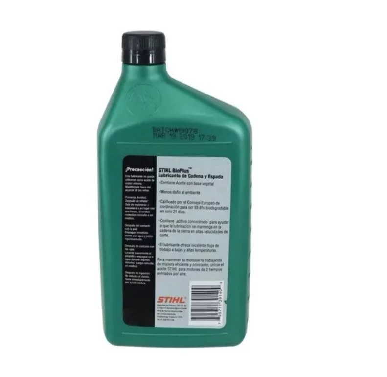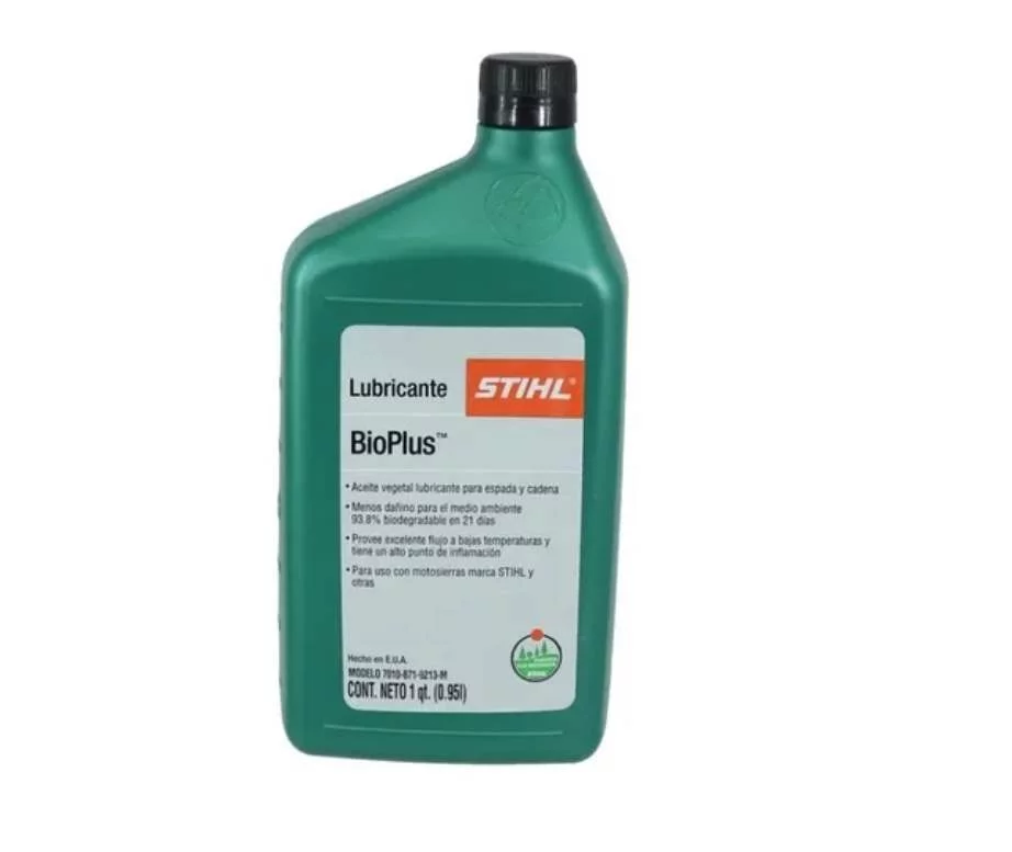 Aceite biodegradable Bioplus para aplicación en cadenas, es utilizado para que las cadenas tengan una larga vida y cuenta con base de aceites vegetales lo convierten el un producto amigable con el medio ambiente, personas, microorganismos y plantas. Cumple con todos los requisitos para su uso con motosierras STIHL.