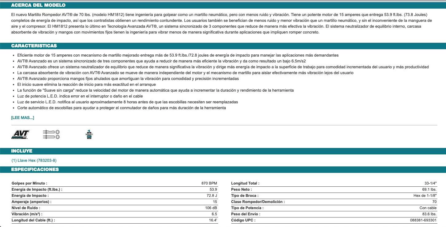 El nuevo Martillo Rompedor AVT® de 70 Ibs. (modelo HM1812) tiene ingeniería para golpear como un martillo neumático, pero con menos ruido y vibración. Tiene un potente motor de 15 amperes que entrega 53.9 ft.lbs. (73.8 Joules) completos de energía de impacto, así que los contratistas obtienen un rendimiento contundente. Los usuarios también se benefician de menos ruido y menor vibración que un martillo neumático, y sin el inconveniente de la manguera de aire y el compresor. El HM1812 presenta lo último en Tecnología Avanzada AVT®, un sistema sincronizado de 3 componentes que reduce de manera más efectiva la vibración. El sistema neutralizador de equilibrio interno, carcasa absorbente de vibración y mangos con movimientos fijos tienen la ingeniería para vibrar menos de manera significativa durante aplicaciones que impliquen romper concreto.