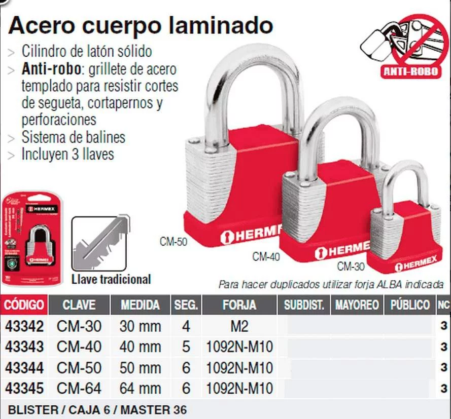 CANDADO LAMINADO.LLAVE TRADICIONAL. 64MM CM-64 HER