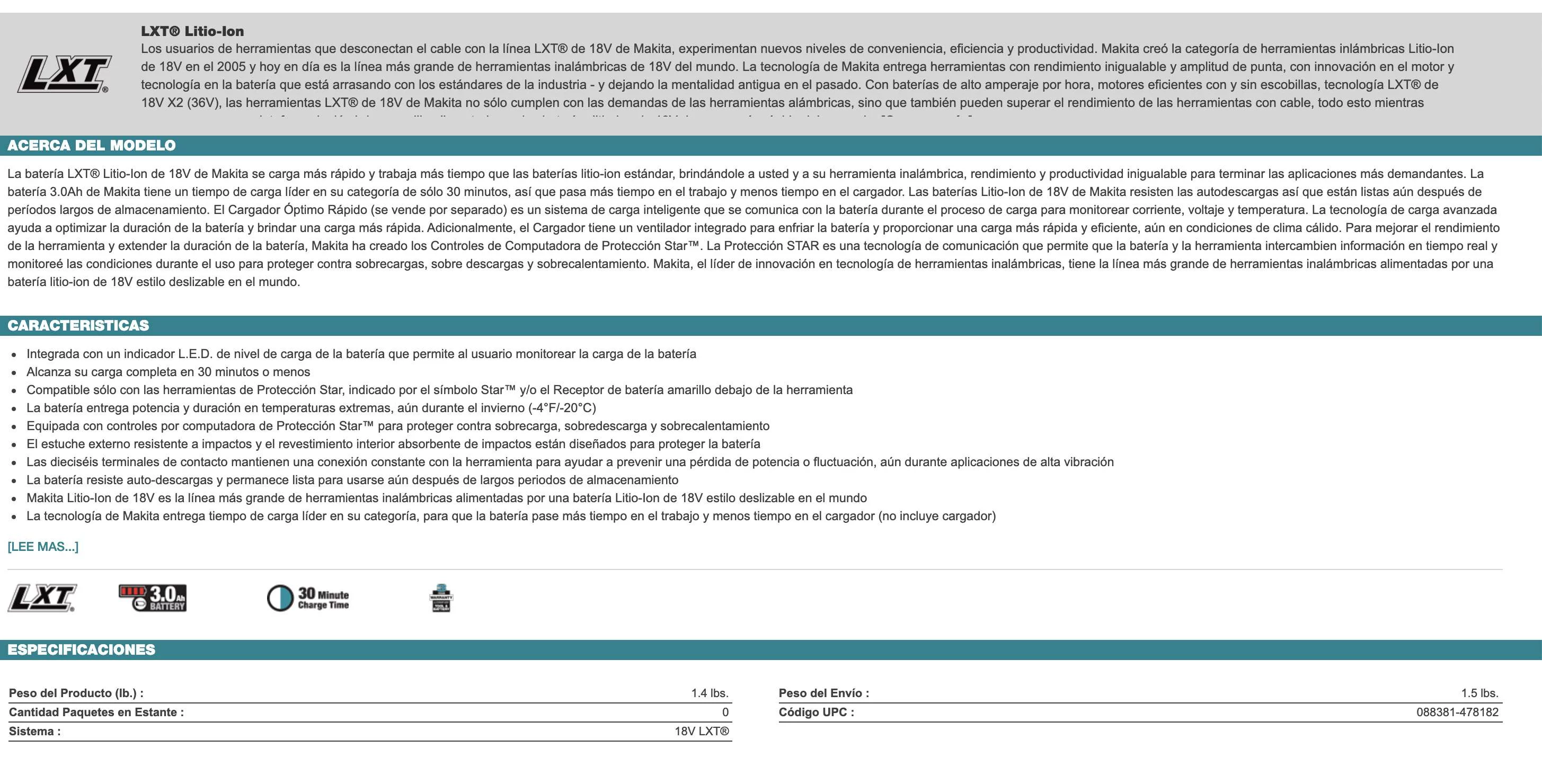 BATERIA 18V 3AH LXT LITIO-ION 30MIN CARGA MAKITA