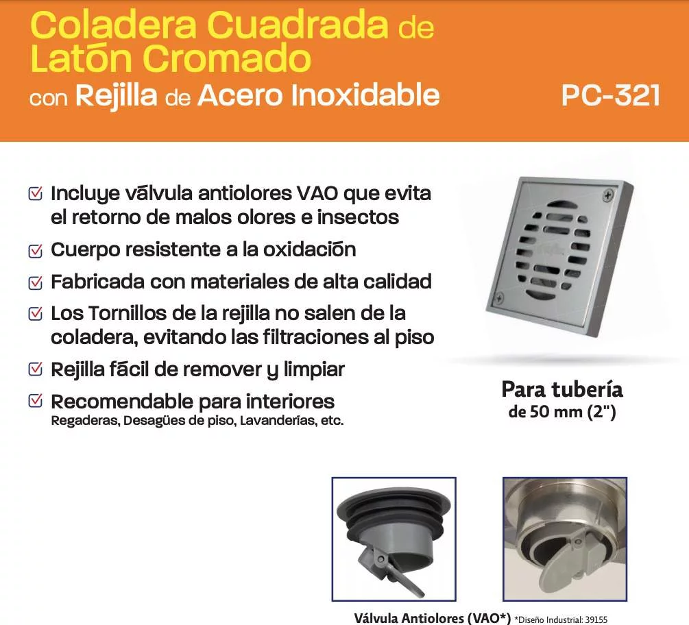 COLADERA CUADRADA LATON CROMADO REJILLA ACERO INOX