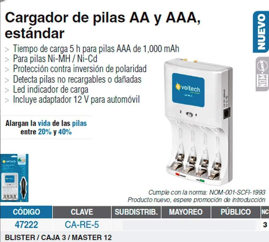CARGADOR DE PILAS AA Y AAA. ESTANDAR. CA-RE-5 VOLT