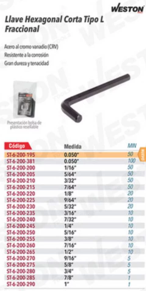 LLAVE ALLEN HEXAGONAL CORTA TIPO L 1/2