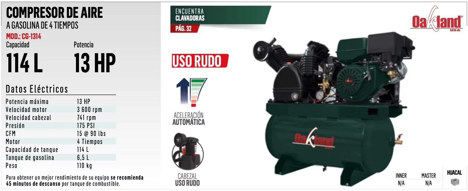 COMPRESOR GASOLINA 5HP 2ETAP OAKLAND 14HP 114L 175