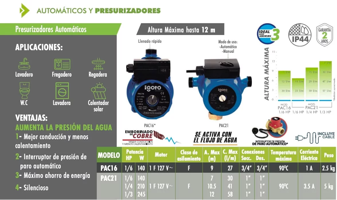 BOMBA PRESURIZADORA 1/6HP 3/4X3/4 90C 27LPM IGOTO