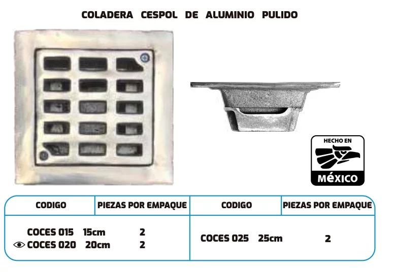 COLADERA ALUMINIO CON CESPOL 20X20 PLOMERO