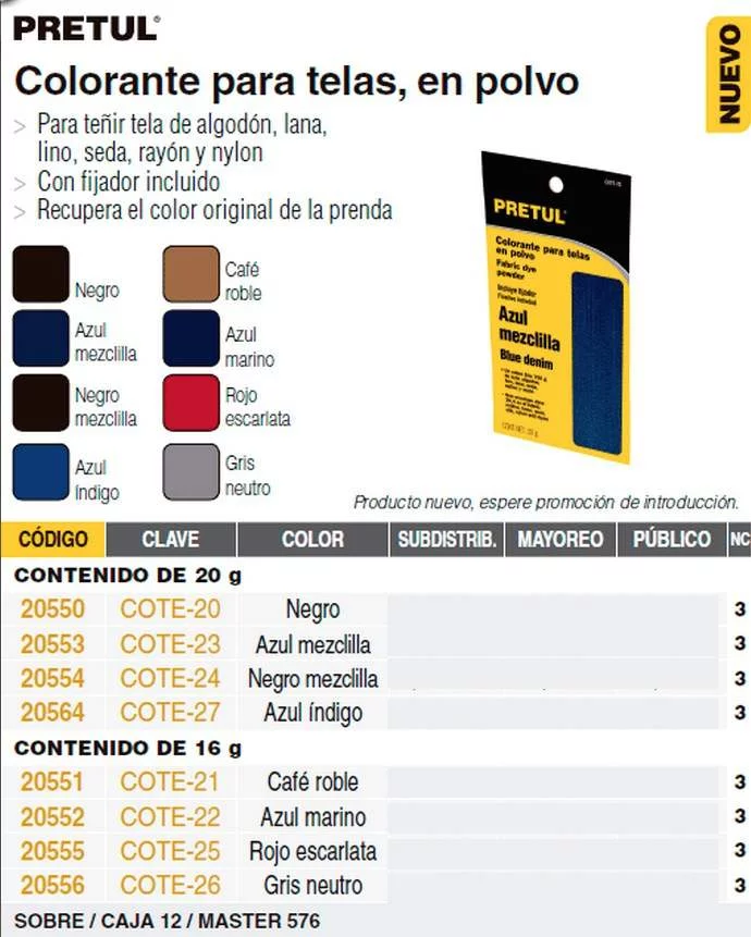 COLORANTE TELA POLVO 16G CAFE ROBLE COTE-21 PRETUL