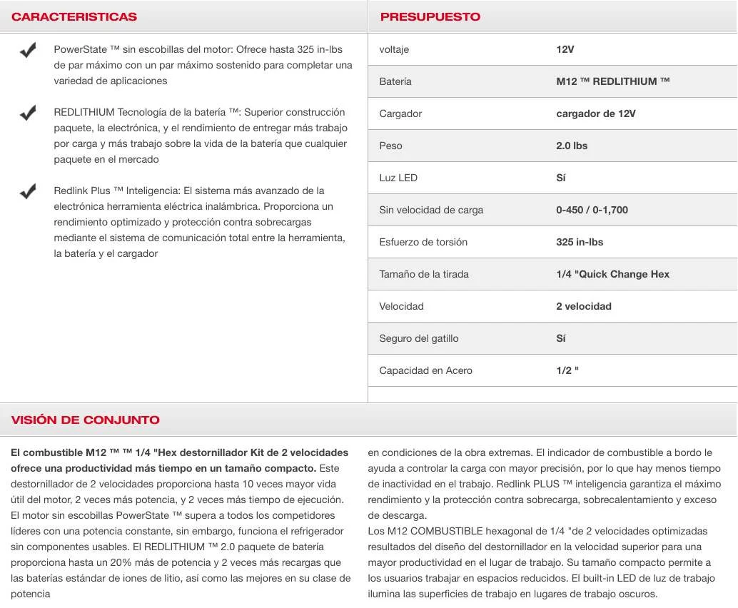 El combustible M12 ™ ™ 1/4 "Hex destornillador Kit de 2 velocidades ofrece una productividad más tiempo en un tamaño compacto. Este destornillador de 2 velocidades proporciona hasta 10 veces mayor vida útil del motor, 2 veces más potencia, y 2 veces más tiempo de ejecución. El motor sin escobillas PowerState ™ supera a todos los competidores líderes con una potencia constante, sin embargo, funciona el refrigerador sin componentes usables. El REDLITHIUM ™ 2.0 paquete de batería proporciona hasta un 20% más de potencia y 2 veces más recargas que las baterías estándar de iones de litio, así como las mejores en su clase de potencia