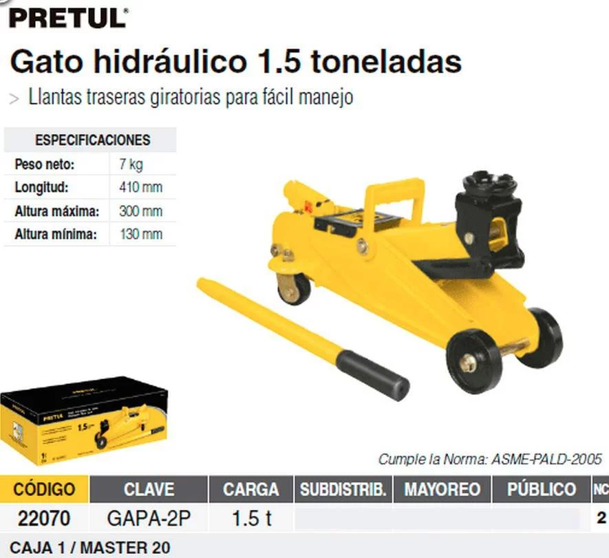 GATO HIDRAULICO DE PATIN 1.5 TON.. PRETUL GAPA-2P