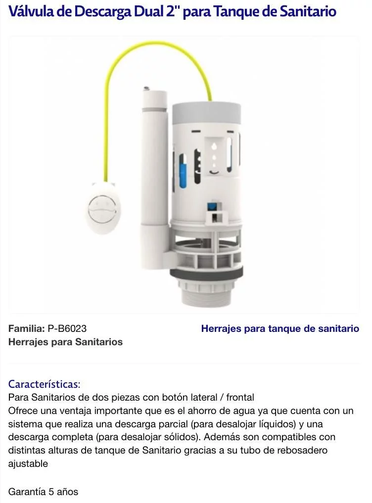 Ofrece una ventaja importante que es el ahorro de agua ya que cuenta con un sistema que realiza una descarga parcial (para desalojar líquidos) y una descarga completa (para desalojar sólidos). Además son compatibles con distintas alturas de tanque de Sanitario gracias a su tubo de rebosadero ajustable