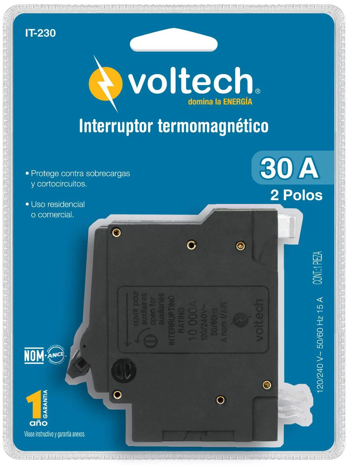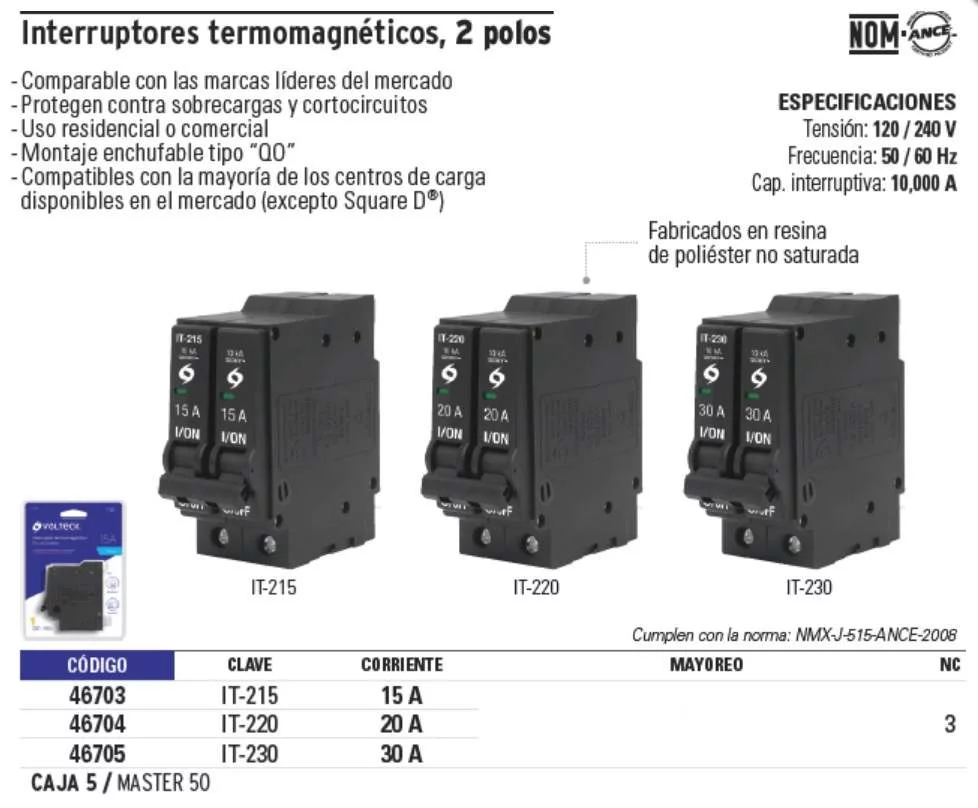 Tensión: 120 / 240 V Frecuencia: 50/60 Hz Cap. interruptiva: 10,000 A