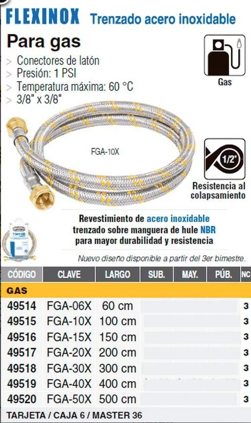 MANGUERA FLEXIBLE PARA GAS 3/8 FLEXINOX 200 CM.
