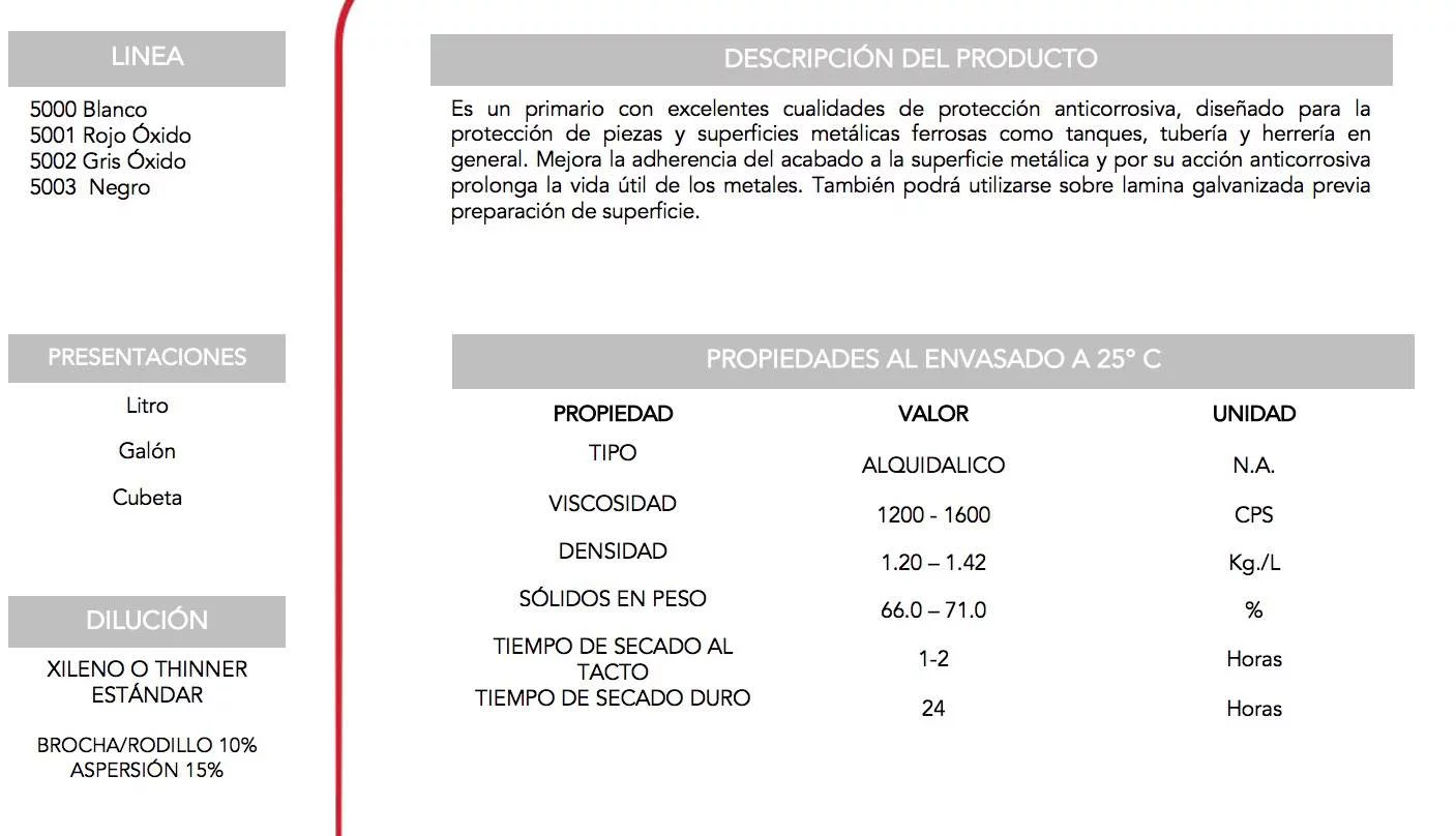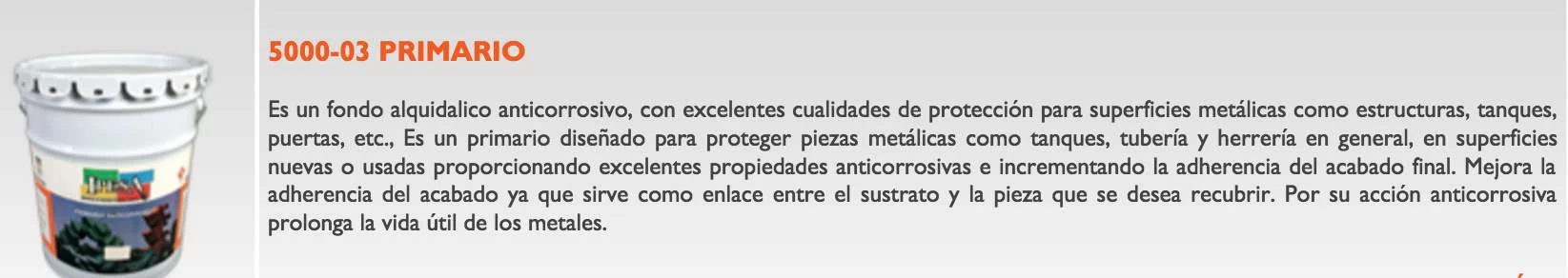 Es un primario con excelentes cualidades de protección anticorrosiva, diseñado para la protección de piezas y superficies metálicas ferrosas como tanques, tubería y herrería en general. Mejora la adherencia del acabado a la superficie metálica y por su acción anticorrosiva prolonga la vida útil de los metales. También podrá utilizarse sobre lamina galvanizada previa preparación de superficie.