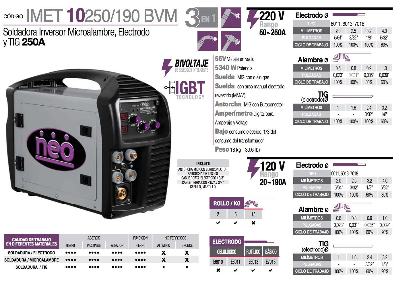 SOLDADORA INVERSOR MMA/TIGHF/MIG 50-250A 110/220V NEO