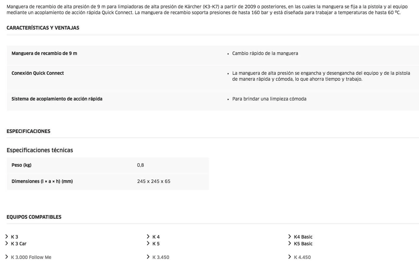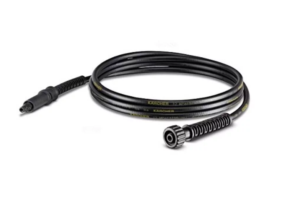 Manguera de recambio de alta presión de 9 m para limpiadoras de alta presión de Kárcher (K3-K7) a partir de 2009 o posteriores, en las cuales la manguera se fija a la pistola y al equipo mediante un acoplamiento de acción rápida Quick Connect. La manguera de recambio soporta presiones de hasta 160 bar y está diseñada para trabajar a temperaturas de hasta 60 °C.