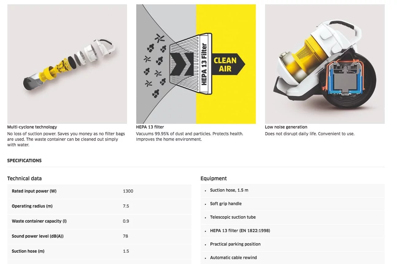 No loss of suction power. Saves you money as no filter bags are used. The waste container can be cleaned out simply with water.