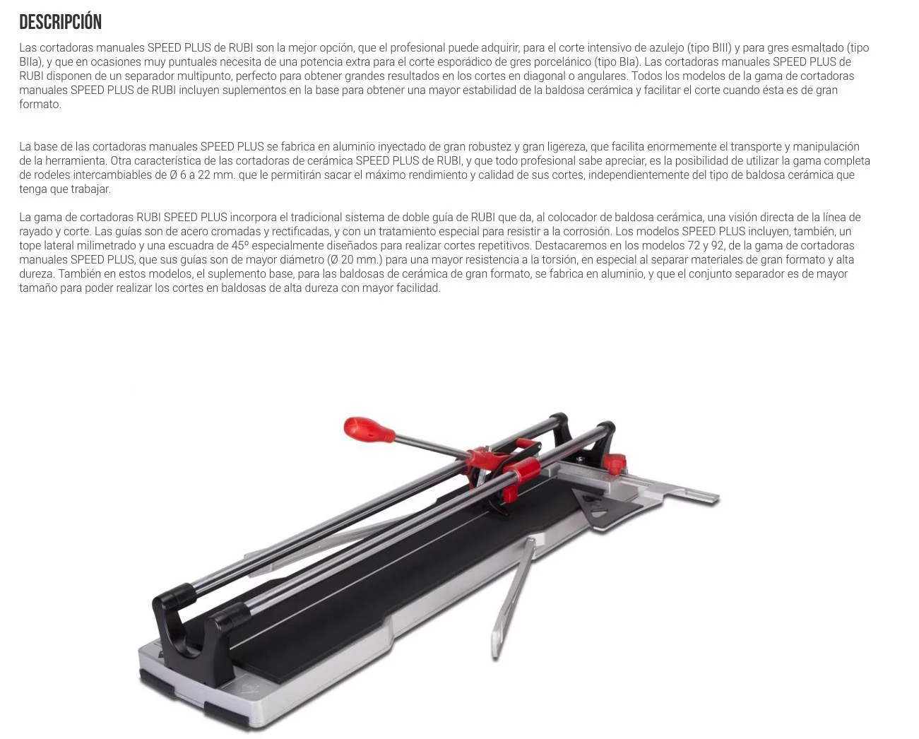La gama de cortadoras RUBI SPEED PLUS incorpora el tradicional sistema de doble guía de RUBI que da, al colocador de baldosa cerámica, una visión directa de la línea de rayado y corte. Las guías son de acero cromadas y rectificadas, y con un tratamiento especial para resistir a la corrosión. Los modelos SPEED PLUS incluyen, también, un tope lateral milimetrado y una escuadra de 45° especialmente diseñados para realizar cortes repetitivos. Destacaremos en los modelos 72 y 92, de la gama de cortadoras manuales SPEED PLUS, que sus guías son de mayor diámetro (0 20 mm.) para una mayor resistencia a la torsión, en especial al separar materiales de gran formato y alta dureza. También en estos modelos, el suplemento base, para las baldosas de cerámica de gran formato, se fabrica en aluminio, y que el conjunto separador es de mayor tamaño para poder realizar los cortes en baldosas de alta dureza con mayor facilidad.