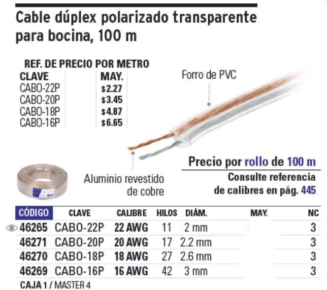 CABLE PARA BOCINA 22 AWG TRANSPARENTE 100M.