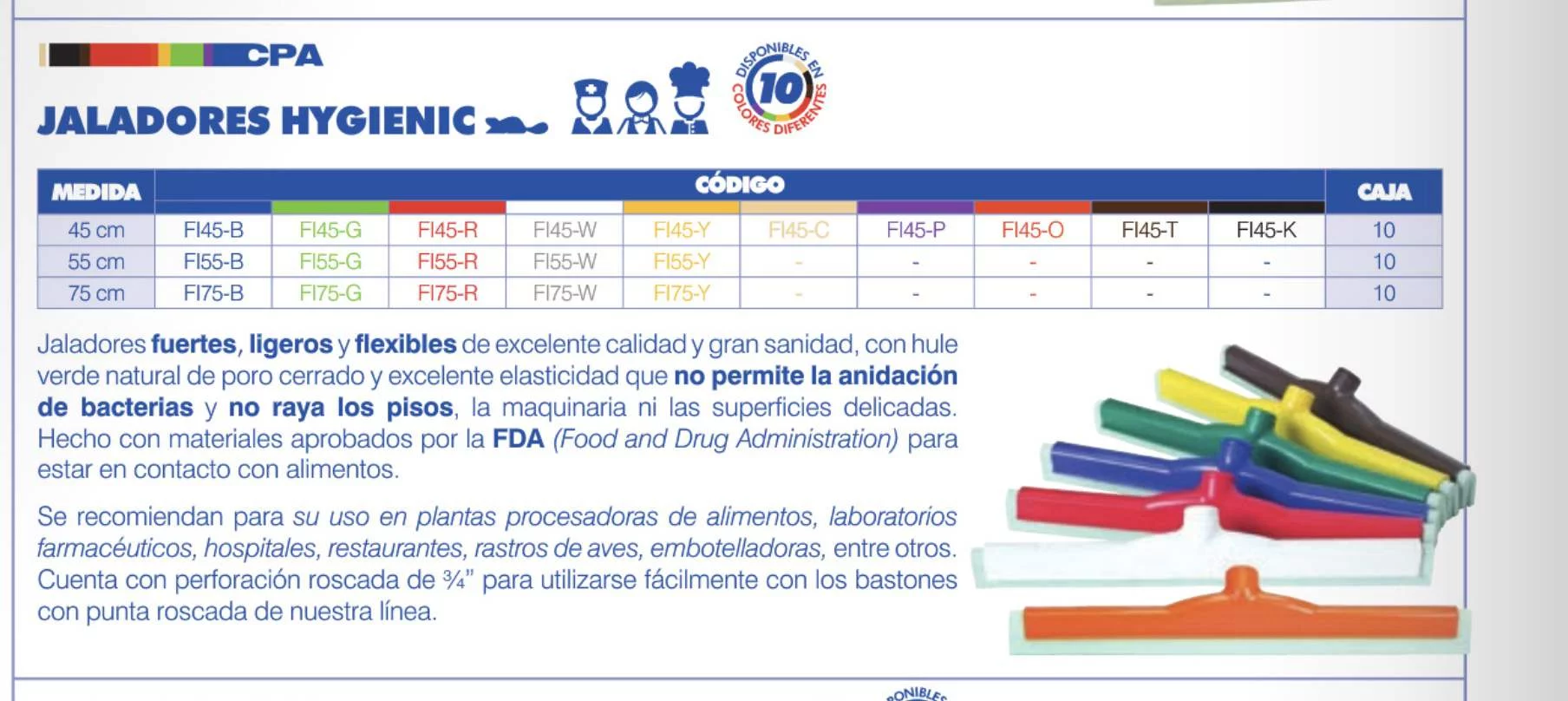 Jaladores fuertes, ligeros y flexibles de excelente calidad y gran sanidad, con hule verde natural de poro cerrado y excelente elasticidad que no permite la anidación de bacterias y no raya los pisos, la maquinaria ni las superficies delicadas. Hecho con materiales aprobados por la FDA (Food and Drug Administration)para estar en contacto con alimentos.