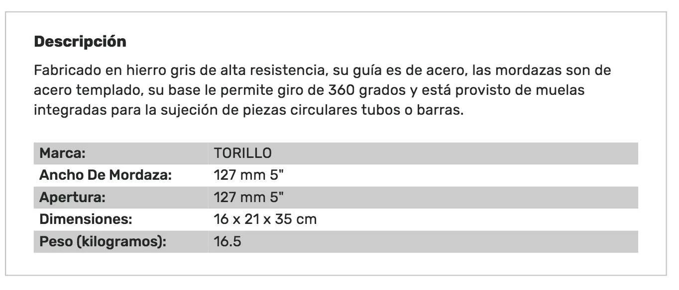 Fabricado en hierro gris de alta resistencia, su guía es de acero, las mordazas son de acero templado, su base le permite giro de 360 grados y está provisto de muelas integradas para la sujeción de piezas circulares tubos o barras.