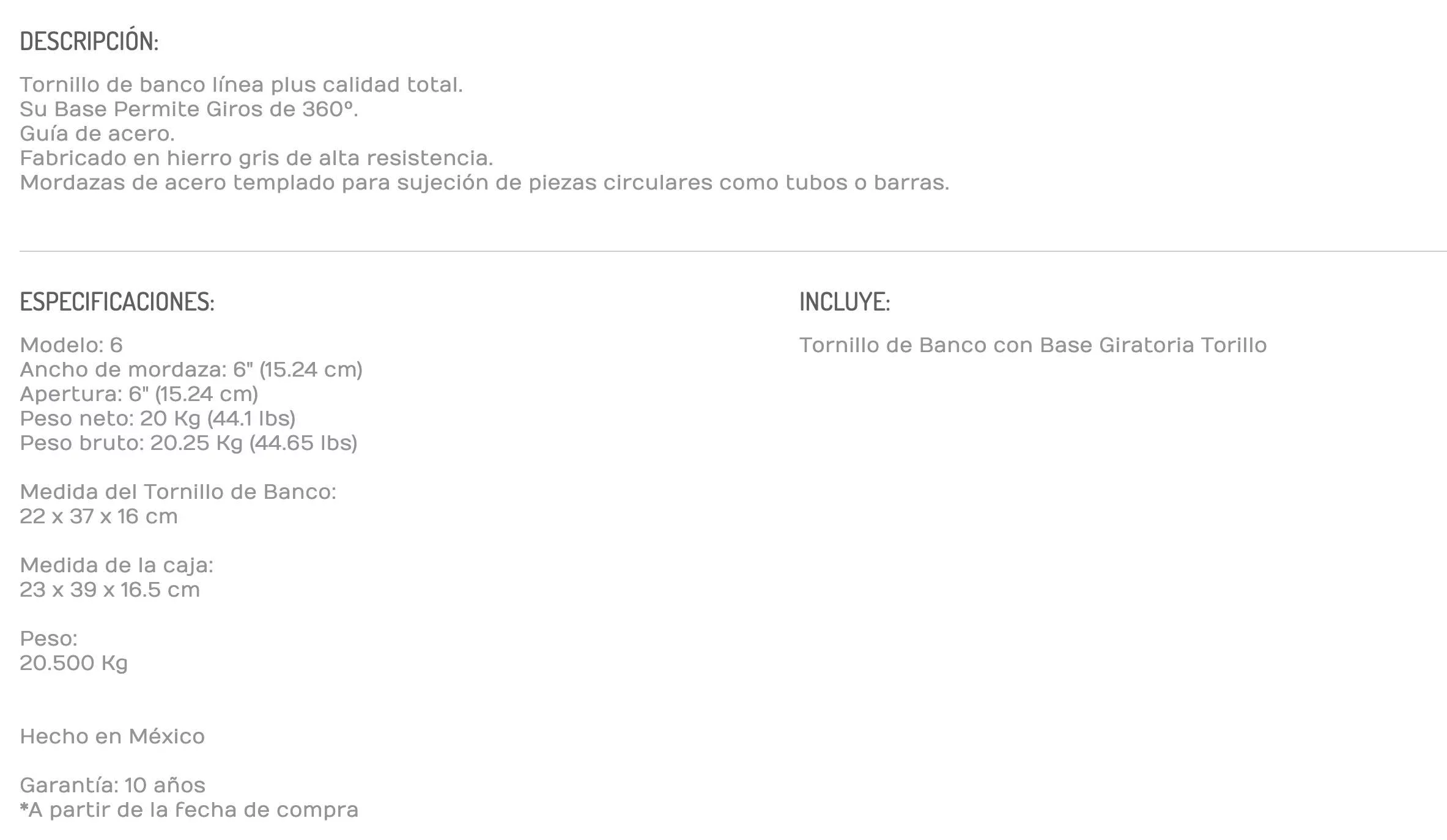TORNILLO DE BANCO PLUS 6 TORILLO