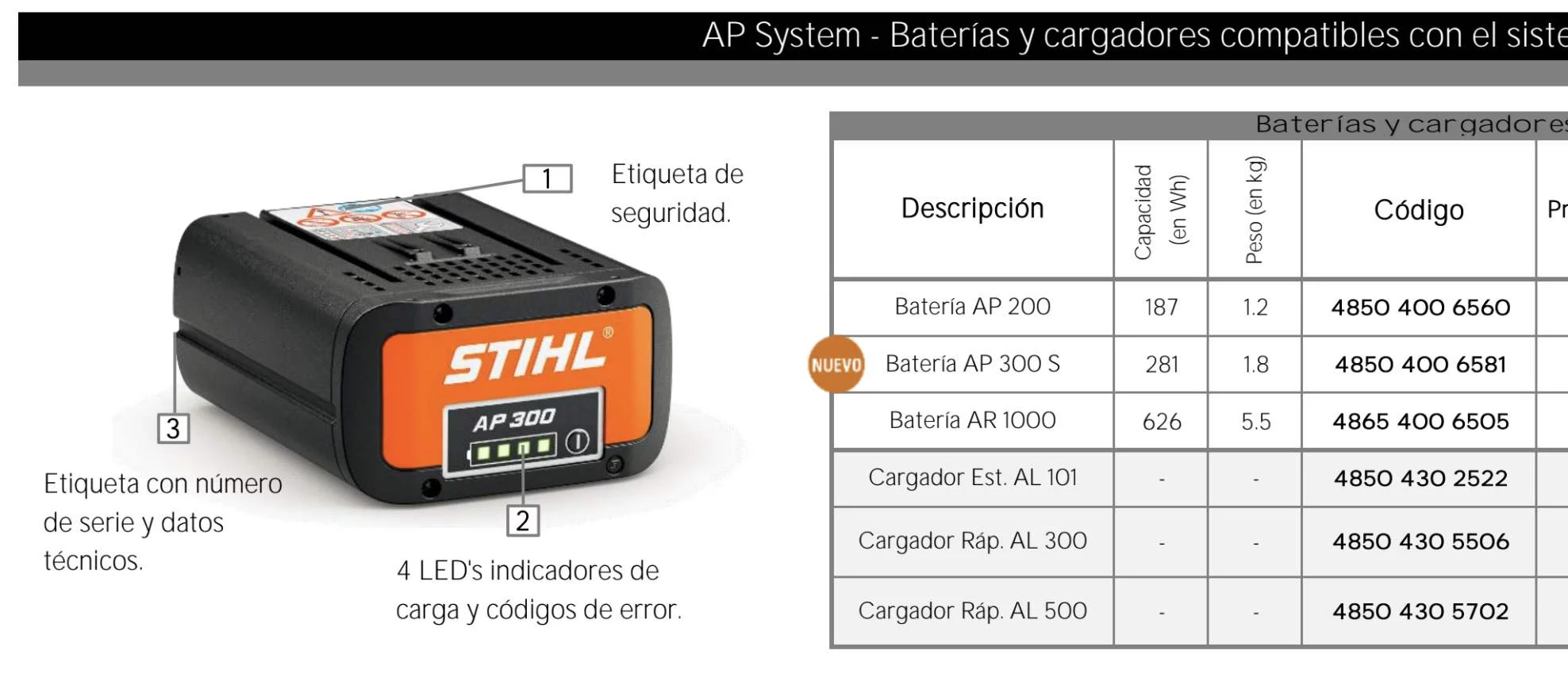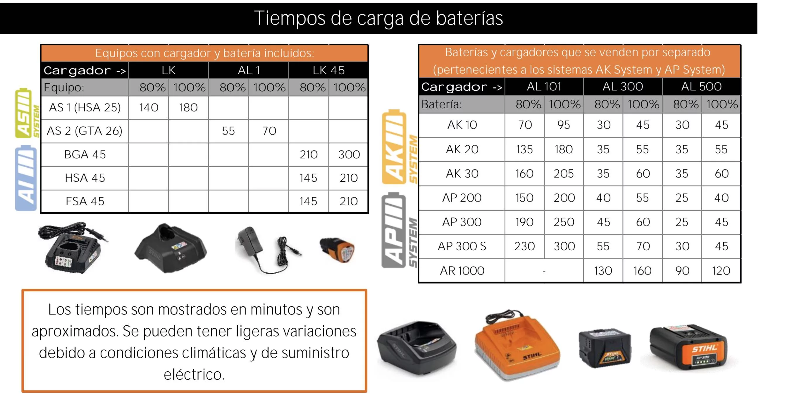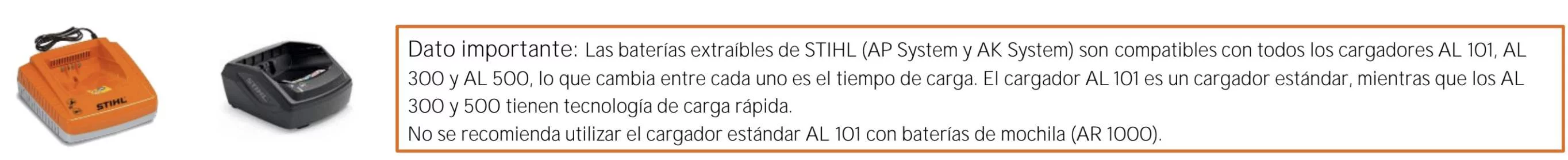 Dato importante: Las baterías extraíbles de STIHL (AP System y AK System) son compatibles con todos los cargadores AL 101, AL 300 y AL 500, lo que cambia entre cada uno es el tiempo de carga. El cargador AL 101 es un cargador estándar, mientras que los AL 300 y 500 tienen tecnología de carga rápida.
