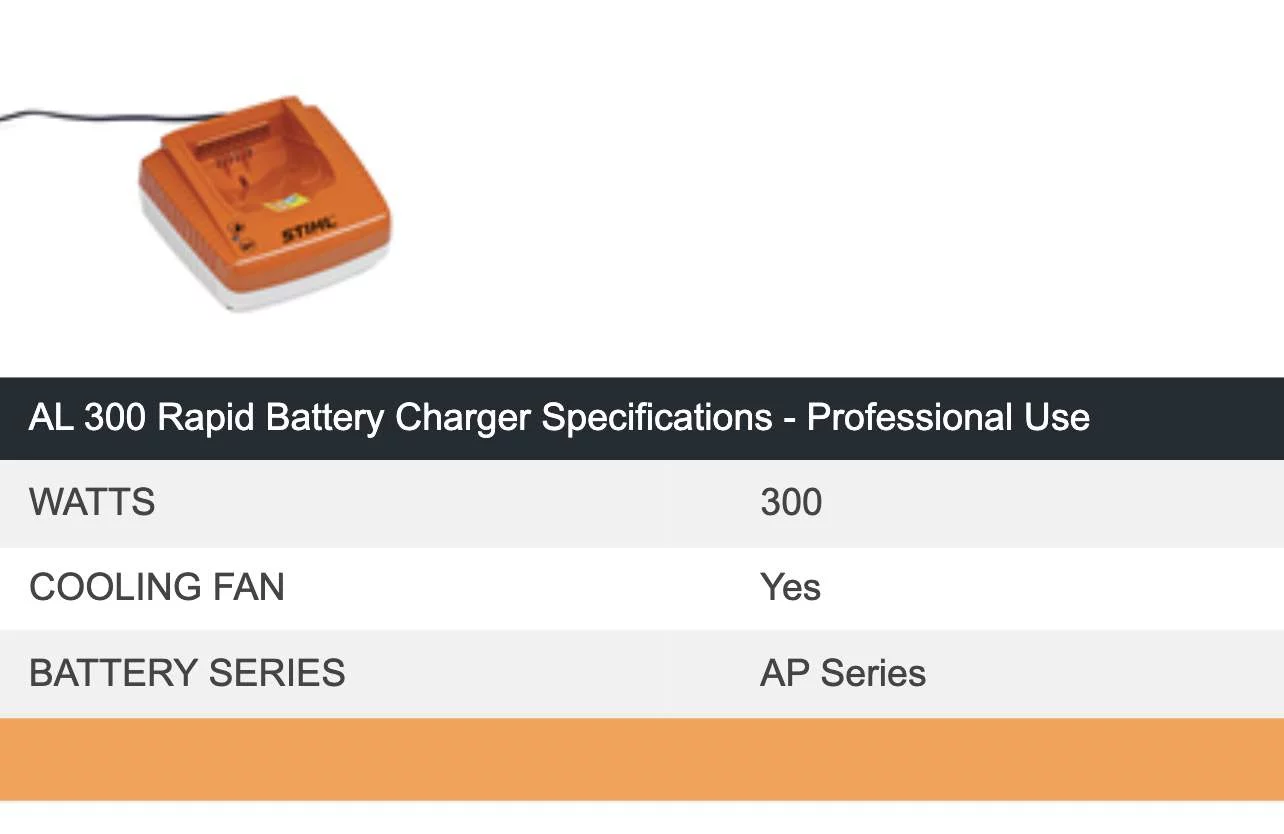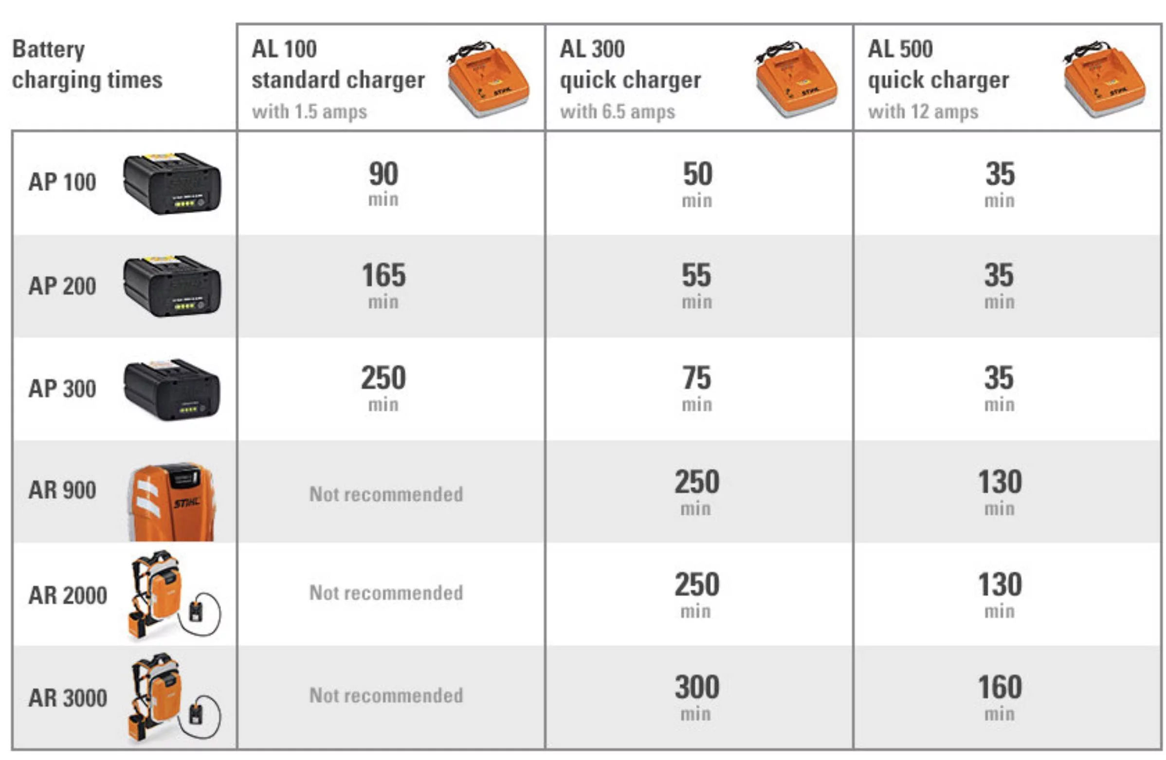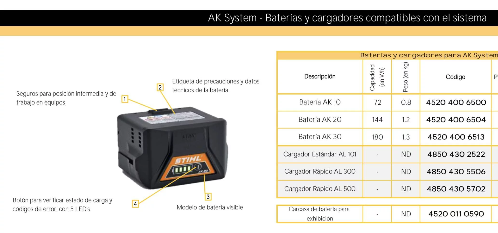 Dato importante: Las baterías extraíbles de STIHL (AP System y AK System) son compatibles con todos los cargadores AL 101, AL 300 y AL 500, lo que cambia entre cada uno es el tiempo de carga. El cargador AL 101 es un cargador estándar, mientras que los AL 300 y 500 tienen tecnología de carga rápida.