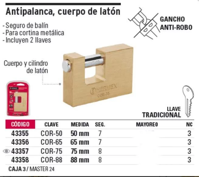 CANDADO ANTIPALANCA. LLAVE TRADICIONAL 88MM COR-88