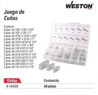 5 pzas. de 1/4'x1/4'x1-1/2' Spzas deS/16'xS/16'x11/2* 5 pzas. de $/16'x5/16'x1-1/4' 5pzasde3/8'x3/8'x11/4-5pzasde3/8'x3/8'x11/2' 2 pzas.de 1/2'x1/2’x1-1/2'